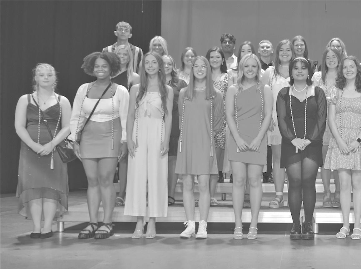 Academic Letter Winners — Front row: Ali Franks (AP Social Studies, Social Studies), Jessie Huff (Art, English), Rachel Huff (Art), Hannah Perrigan (Art), Chloe Stinnett (Chorus), Abigail Erby (Math), Kayla Whitt (Social Studies). Back row: Anthony Steinbacher (AP Social Studies, Social Studies), Samara Kassab (Band), Sneh Patel (Biological Sciences), Connor Collett (Chorus), Braden Barnes (AP Calculus AB), Easton Smith (DE Calc), Nathaniel Wines (Theater, English Stanard). Not pictured: Marcelo Vargas (Band), Jody Vaughan (Band), Daniel Stewart (English Standard), Nelson Gillespie (NJROTC), Johnathan Rivera (NJROTC), Elijah Gunter (Physical Sciences), Baylor Baxter (Social Studies), Nelson Gillespie (Social Studies), Karlee Turner (Theater).