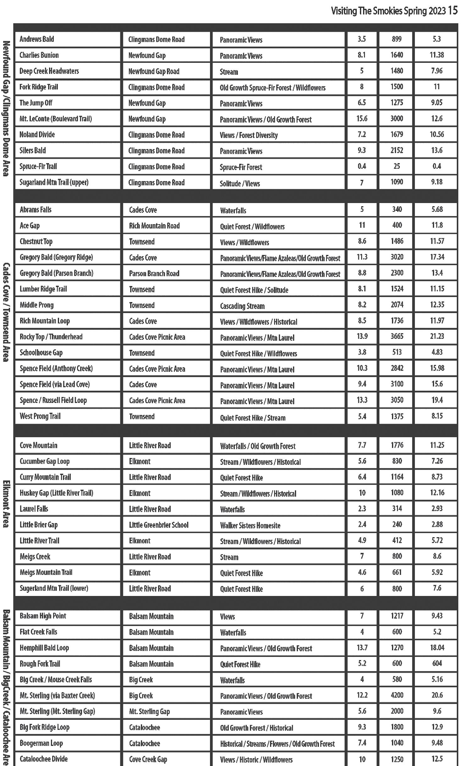 Area residents have their own favorites among difficult trails. There is the 5-mile hike to Spence Field, one of the Smokies ’ famous and mysterious balds. Those still able to breathe normally after that last push to the top may continue on to Rocky Top, which lent its name to the song popular with the Tennessee Volunteers.