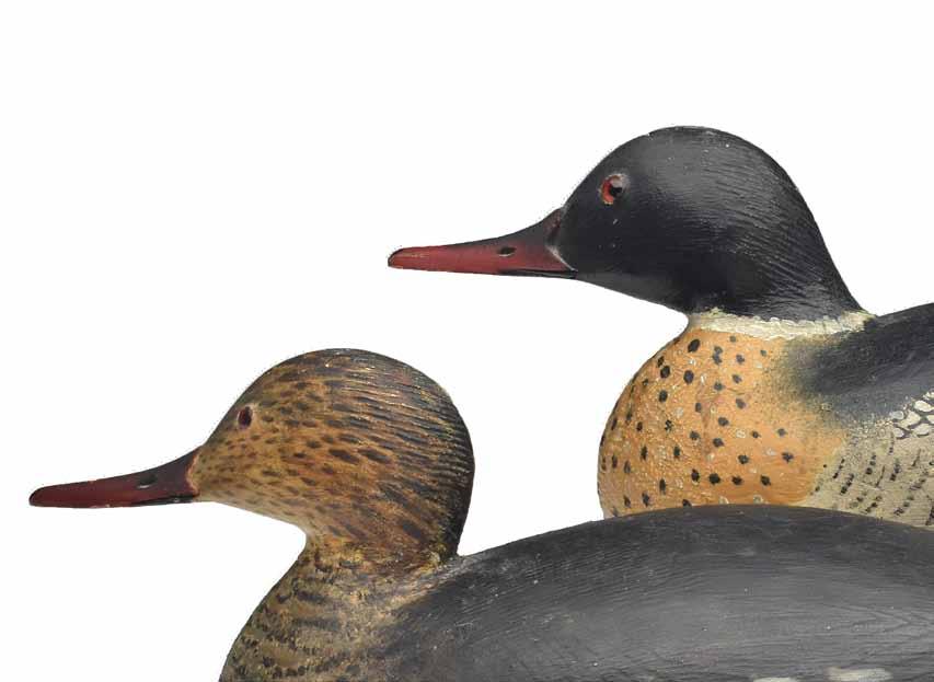 53 Rigmate pair of mergansers, Willie Ross, Chebeague Island, Maine, 1st quarter 20th century. Inlet neck seats and original peacock plume crests, which rarely survived. Measures 17.5” and 18.75” long. Excellent original paint with minor gunning wear; thin band of touchup to a fine hairline crack in hen’s neck; drake with tight crack in neck secured by a few small nails; drake’s bill is a nearly undetectable professional replacement.
