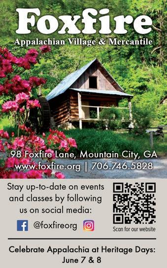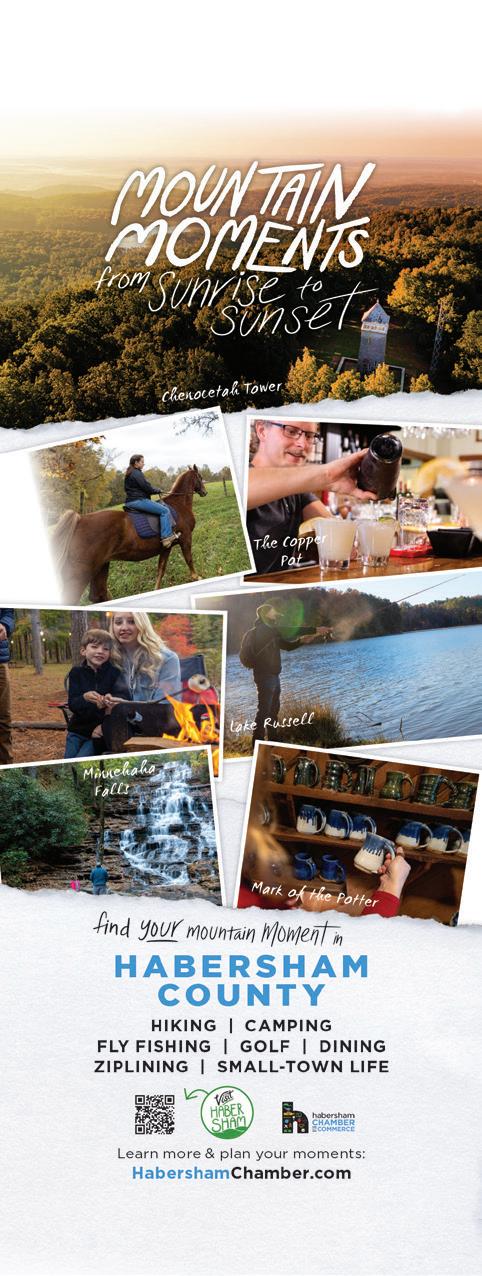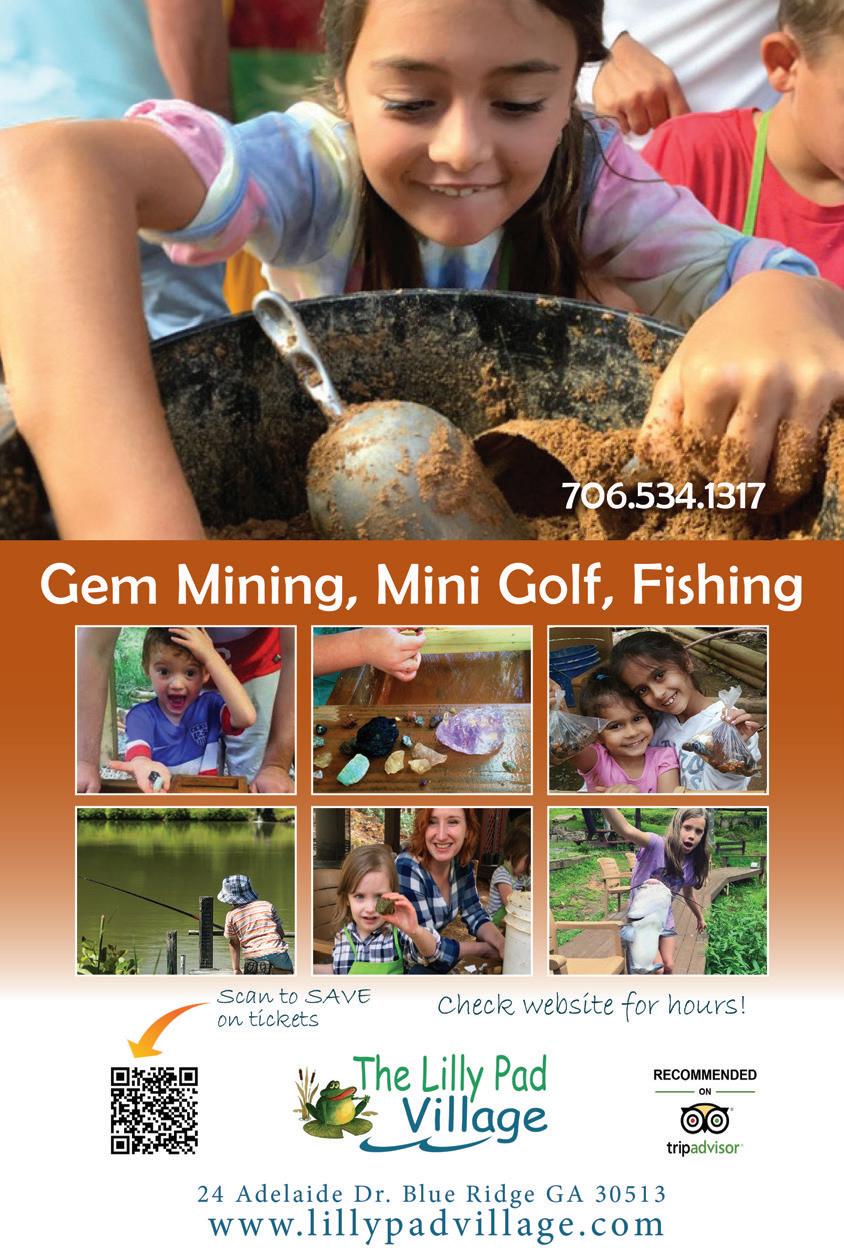 12 | vACATION GUIDE in the Mountains www.mountainlakeguide.com | Spring / Summer 2024 182 82 SITES WITH FULL HOOK-UP Amenities include: Swimming Pool • Fire Pit Playground • 6 Private Baths Laundry Room • Check-in Rec Room 706-746-0078 323 Yorkhouse Rd • Rabun Gap, GA willowvalleyrv.com • info@willowvalleyrv.com • Historic operating grist mill (in operation since 1840) • 85’ cascading waterfall • Four guest rooms • Gourmet 3-course breakfast (featuring milled products) www.sylvanfallsmill.com Located in beautiful Rabun Gap, GA Information or reservations: (706) 746-7138 “Not your run-ofthe-mill B&B” 190 Find Us On Facebook! Reel In Potential Visitors Trying to increase business? www.MountainLakeGuide.com Get the best advertisement coverage available in the mountains. Get website exposure for your business. Distribution – 500 locations in North Georgia Mountains, All Georgia State Visitor Centers, & Atlanta. info@mtnlakepub.com 888.896.2412