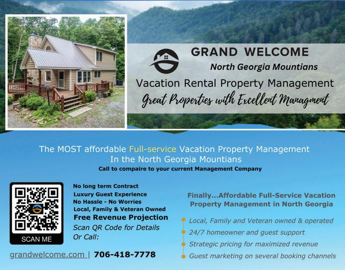 2 | vACATION GUIDE in the Mountains www.mountainlakeguide.com | Spring / Summer 2024 Concierge services: Grocery Services In-Cabin Chef We can arrange unique shopping trips, vineyard tours, festival admission, hiking & biking adventures, horseback riding, fishing, boating and whitewater rafting trips. With over 17 years experience in the hospitality industry, you can be assured that your stay with us and the customer service you receive will always be superior! Our goal has been, and always will be, to exceed your expectations so you will return time and time again. www.MountainOasisCabinRentals.com Mountain Oasis Cabin Rentals, Inc. 2218 Hwy 52 East, Ellijay, GA 30536 Toll Free: 844-306-2747 Local: 706-276-4343 Expect the Best Immaculate Accommodations Mountain / Water Views Private Pools / Hot Tubs Ultra Luxury 1-5 Bedrooms Jetted Tubs Screened Porches Pet Friendly Game Rooms / Pool Tables Outdoor Fireplaces / Pits NOW PROUDLY OFFERING: Vacation Rentals, Long-Term Rentals, Real Estate Services 482