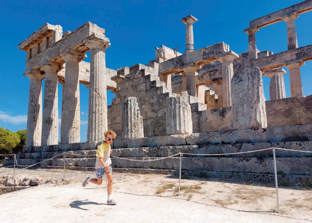 We spend less than an hour wandering - or in Harrison’s case running, and his sister’s case cartwheelingaround the temple, before heading back down through the forest to the sleepy town of Agia Marina. You wouldn’t think that this is one of the bigger towns on the island, such is the laid-back atmosphere when we get there. There are a few restaurants and shops, but the town feels all but deserted, given that it’s mid-August in Greece. We find more life at the beach, where there is a water sports centre,