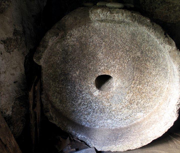 nascente numa presa que, depois, por via de uma levada de nível, conduziria a água diretamente até ao cubo. No caso dos moinhos associados ao domínio público hídrico (Moinho do Fontão (4), n.º inv. 243, e Moinho de Ranhô (2), n.º inv. 245) a água era captada por intermédio de um açude construído no leito da linha de água e posteriormente guiada para o cubo por via de uma levada de nível. Em todos os moinhos foram identificados cubos tubulares – 2 circulares, em cimento, e 2 quadrangulares, em granito. Uma derradeira nota para os grafitos identificados nestas moagens. Dos 4 moinhos estudados, 3 ostentam grafitos molinológicos. No total, fora registados 6 grafitos pertencentes a 3 subtipologias distintas (Nunes & Lemos, 2017): 4 grafitos cruciformes do tipo C1 (cruz simples grega e latina), 1 grafito cruciforme do tipo C8 (cruciforme de base semicircular) e ainda 1 grafito do tipo inscrição, designadamente subtipologia "texto + data". Relativamente aos últimos dados publicados (Nunes & Lemos, 2022, pp. 1-8) que incluíam 434 grafitos molinológicos registados em 71 moinhos de água, acrescem agora os dois grafitos detetados