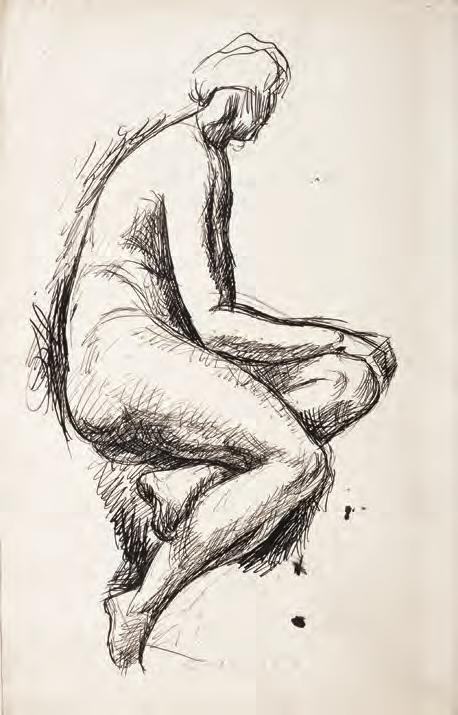 Además de la serie parisina aparece en el conjunto de los desnudos de mujeres el papel C at 36 (reverso) con dos desnudos de mujer –que puede leerse como reverso del C at . 36– y que inician una pequeña serie con las piezas C at . 37, C at . 38, C at . 39, tintas que marcan distintas poses y, en la mayoría, con el detalle del uso de medias que cubren las piernas hasta la mitad del muslo, iconografía que remite con fuerza a las mujeres de los burdeles. Son imágenes básicamente de líneas muy expresivas, sutiles, entre continuas y quebradas. La modelo parece ser siempre la misma.