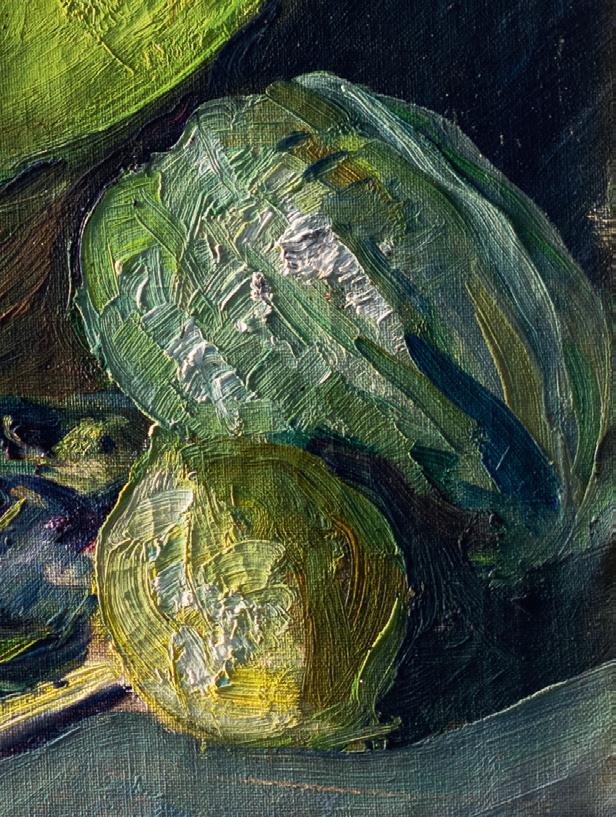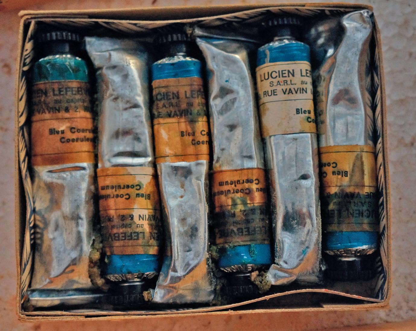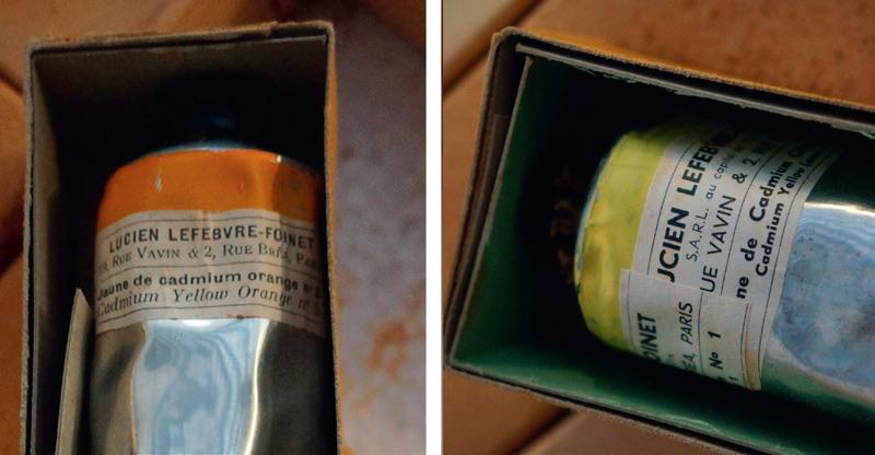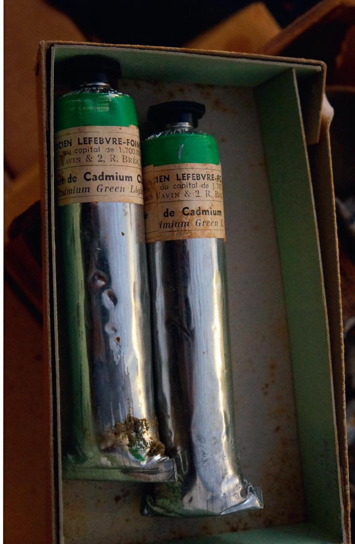 En los talleres encontramos diecinueve tubos de verde cadmio claro y siete de verde cadmio oscuro, todos de la marca Lucien Lefebvre-Foinet , por lo que parece ser que el verde cadmio era uno de sus favoritos. El verde cadmio no es un pigmento en sí, sino que es una mezcla de amarillo de cadmio y viridian.
