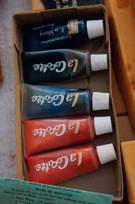 Aunque encontramos en los talleres algunos tubos de las marcas Mir, Winsor & Newton y Lefranc, la gran mayoría de los tubos de óleo conservados son de la marca Lucien Lefebvre-Foinet. En Son Boter se conserva una caja de cartón apaisada la cual contiene ciento treinta y nueve tubos de pintura al óleo, la mayoría son de la marca Lucien Lefebvre-Foinet [F. 03]. La caja parece corresponder a un pedido del año 1966, ya que muestra la fecha “VII/66” en muchas de las cajas. La mayoría de los tubos se encuentran sin estrenar y todavía conservan sus embalajes originales, en cajas de cartón individuales para los tubos más grandes, y cajas de cinco o seis tubos en el caso de los pequeños. Por primera vez se han abierto todas las cajas y documentado fotográficamente cada uno de los tubos de pintura. Muchos de estos tubos se encuentran en un estado muy avanzado de deterioro, por lo que su documentación y conservación es esencial antes de que se pierda la información de las etiquetas.