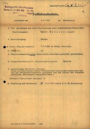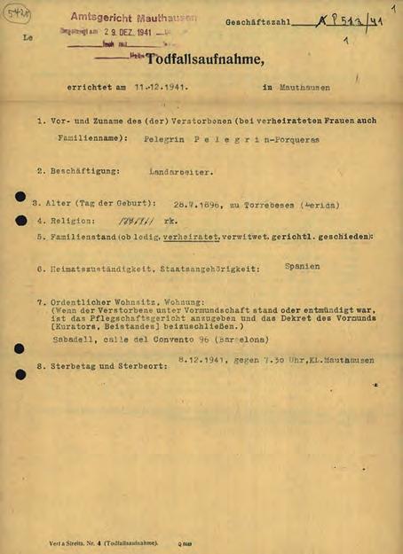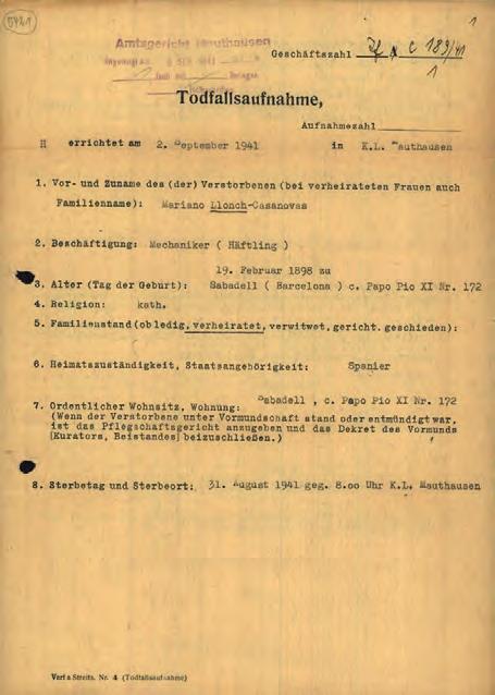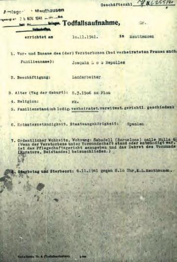 MEMÒRIA I FAMÍLIA Als Arxius d’Arolsen (Alemanya) s’hi conserven, entre d’altres documents, la inscripció de la seva defunció al subcamp de Ternberg, registrada el 23-6-1943, com també el seu registre als llibres d’entrades, de matrícules i de defuncions del camp de Mauthausen, i un certificat de defunció posterior de l’any 1953, emès pels mateixos arxius alemanys de Bad Arolsen. El 8 de novembre de 1950 i a través del Ministeri dels Antics Combatents i Víctimes de la Guerra / Fitxers i Estat Civil “Deportats”, de la República Francesa, es va emetre un avís oficial de la seva defunció, que havia de