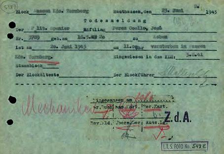 MEMÒRIA I FAMÍLIA Als Arxius d’Arolsen (Alemanya) s’hi conserva la inscripció de la seva defunció, registrada al KL de Mauthausen amb data de l’11-11-1941, quatre dies després de la seva mort. El 8 de novembre de 1950 i a través del Ministeri dels Antics Combatents i Víctimes de la Guerra / Fitxers i Estat Civil “Deportats”, de la República Francesa, es va emetre un avís oficial de la seva defunció, que havia de ser notificat al seu germà.164 El 25 de gener de 2020 a Sabadell se li va posar una llamborda stolperstein en record i reconeixement de les víctimes de l’holocaust. Els deportats murcians, inclòs Ginés Pérez, van ser objecte d’un reconeixement extens en el marc del projecte “Murcianos deportados a campos de concentración nazis”, amb el muntatge d’una exposició entre els mesos de juny i setembre de 2021.165