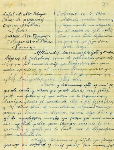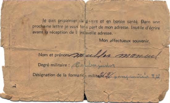 RETIRADA, EXILI I DEPORTACIÓ Es va haver d’exiliar a França i va travessar la frontera pel coll del Pertús. Durant el pas dels Pirineus es va ferir als peus i va ser ingressat en un hospital de sang uns dies. Tot seguit va ser internat al camp de concentració de refugiats d’Argelers. Després va ser traslladat a una Companyia de Treballadors Estrangers a Pommereuil (Alts de França), on ja hi era al 10-3-1940, en plena Segona Guerra Mundial. Després va ser capturat per l’exèrcit nazi i fou traslladat i empresonat primer a l’Stalag XIII-A de HohenfelsOberpfalz (Baviera, Alemanya), amb el núm. 40518, des d’on envià una carta postal (postkarte) a la família, amb data de 5-6-1940, on deia: “Balbina Mateu e hijos. Esposa: estoy prisionero me encuentro bien. Besos y abrazos para todos. De los demás no sé nada”.116 El juliol de 1940 fou traslladat a l’Stalag VII-A de Moosburg (Baviera, Alemanya), d’on sortí el 5-8-1940. Va ser deportat a Mauthausen el 6-8-1940, on ingressà amb el número de matrícula 3185; formava part dels primers grups d’espanyols deportats amb aquest destí. El 24-1-1941 va ser traslladat al camp de Gusen, on va ingressar amb el número de matrícula 9339 i on va acabar morint al cap d’un any.