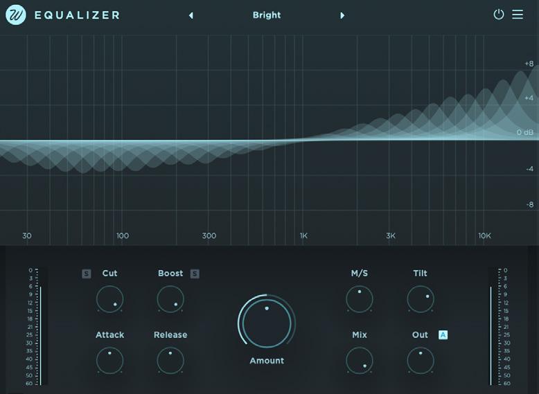 Equalizer works great as a channel EQ for individual tracks like bass, guitars, keyboards, or vocals or as a program/bus EQ, for mastering across the stereo bus as a finishing touch. Interesting features include Mid/ Side processing for EQ only the left and right channels and not changing the mono or center channel. This has the effect of widening the stereo sound stage if you use a Brighten preset.