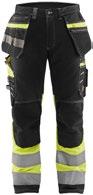 FUNCTIONALITEIT: 4-weg stretch. Meshmateriaal in knieholte. DETAILS: Gulp met kunststof rits. Brede lussen achteraan en aan zijkanten. Twee lussen met knoopsluiting aan de zijkant voor hamerhouder. Metalen knopen. Meshouder met knoop. D-ring in de zoom. 3-dubbel gestikte naden. Afneembare ID-kaarthouder. D-ring. ZAKKEN: Achterzakken met plooi.. Beenzak met klep en klittenbandsluiting met binnenin telefoonzak van mesh.. Beenzak met rits. Steekzakken. Kniebeschermerszakken. Spijkerzakken - extra breed met gereedschapshouders, extra compartimenten en extra zakken met rits. Versterkte duimstokzak met pennenzak en meshouder.. VERSTERKING: CORDURA®-stretch versterkte kniezakken. Versterkte spijkerzakken, duimstokzak, achterzakken en achterkant broekspijpen. REFLECTIE: Reflecterend detail op beenzak. Reflecterende details op de kuit. AFWERKING: Broekspijp voorzien van versterking aan achterkant.. CERTIFICERING: EN 14404:2004+A1:2010 in combinatie met kniebeschermers 4027, 4057, 4058 en 4032.