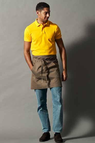 Lange heupschort met tailleband. voorzak in het midden opgesplitst. Lange split in het midden voor comfort. Decoratiestiksels in kleur van keperstof, denimschort heeft gele stiksels.