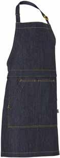 Schort met dubbele functie. Voorzak in het midden opgesplitst en tailleband in de heup. Te gebruiken als slabschort met verstelbare nekband of als heupschort. Het slabbetje kan neergevouwen en verborgen worden. Decoratiestiksels in kleur van keperstof, denimschort heeft gele stiksels.