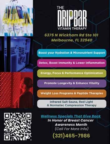 The DRIPBaR Melbourne is celebrating its fourth anniversary in October. Focused on harnessing the power of vitamin therapies, The DRIPBaR aims to help individuals achieve optimal cellular health. “With cutting-edge advances in cellular and biological sciences, we assist clients in combating chronic illness, aging, and supporting conditions like cancer and autoimmune diseases,” says owner Hollie Gilbert. To mark the occasion, The DRIPBaR is offering Three Days of Specials from October 15-17. During these days, clients can enjoy deep discounts on services, including IV Lifestyle Drips, NAD+ and High C IV Drips, Vitamin Shots, Ozone/UBI Therapy, Compression Therapy, Red Light Therapy and Salt Sauna. Those receiving an IV drip during the promotion are also eligible to win a Drip Party for six. “Swag items will be given away with every service,” adds Gilbert. In recognition of Breast Cancer Awareness Month, the center is offering a special Pink Power IV Drip and IM Shot, with a portion of proceeds benefiting a local breast cancer charity. Terms and conditions apply to anniversary specials. For details or to schedule an appointment, call 321-465-7986 or visit TheDRIPBaR.com. The DRIPBaR is located at 6375 N. Wickham Road, Ste. 101, Melbourne. See ad, page 36.