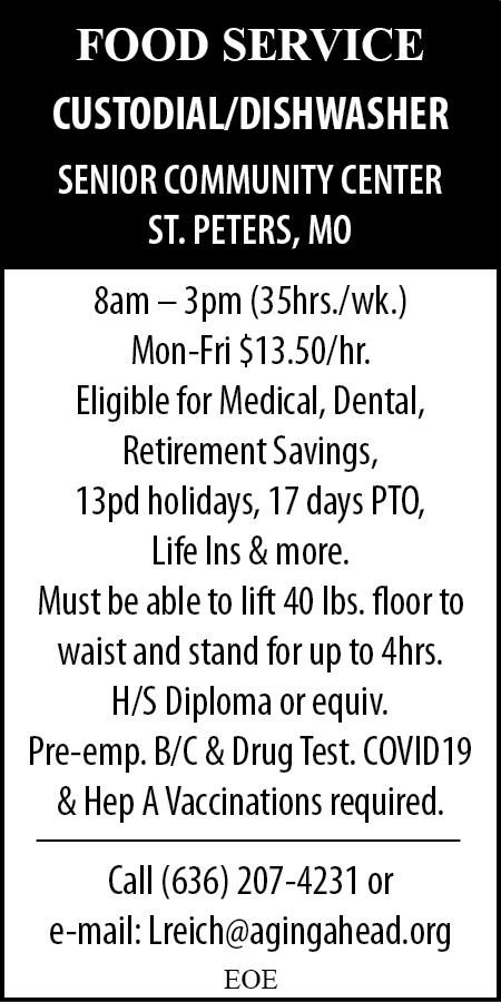 October 12, 2022 • Community News • www.mycnews.comF-2 Feature Check it Out! www.MYCNEWS.com Call Brooke at 636-379-1775 HELP WANTED HELP WANTED Garage Sales Moving Sales Yard Sales Sale of Items CLASSIFIED CALL 636-697-2414 SPECIAL! $45 $15 each additional week after that. $30 for a 1.5” x 2” for the first week (1.5” x 1” ad) COLLECTIBLES SERVICES Say this prayer 9 times a day for 9 days, then publish. Your prayers will be answered. It has never been known to fail. PRAYER