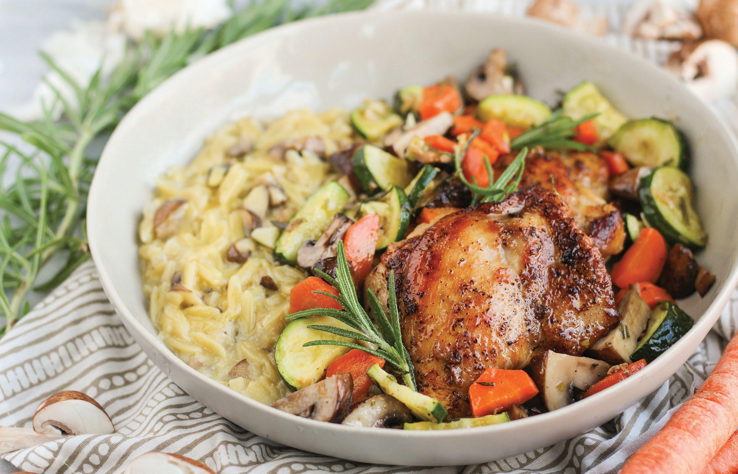 Garlic-Rosemary Butter Roasted Chicken Thighs and Veggies with Mushroom Orzo Risotto