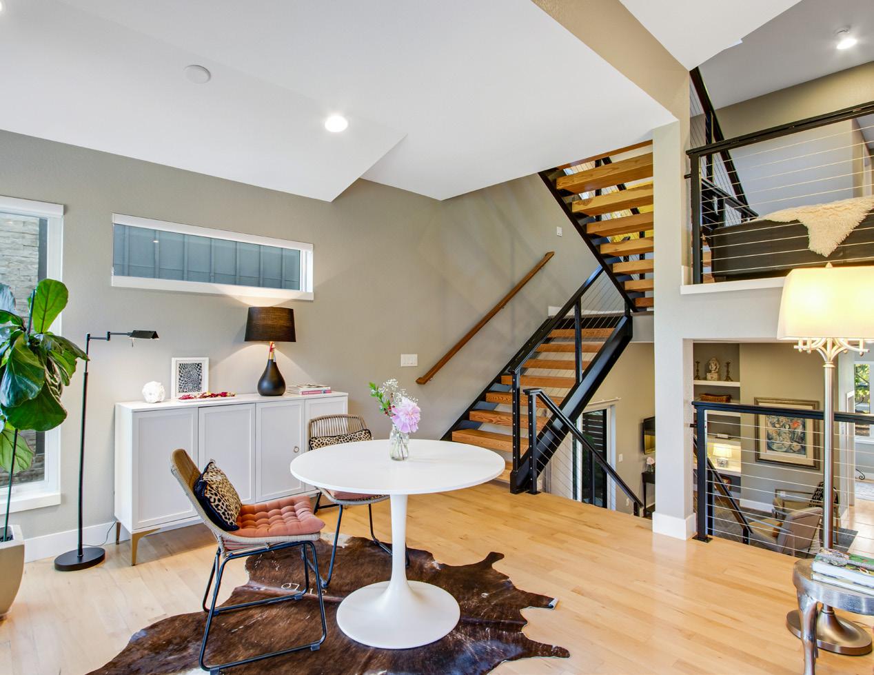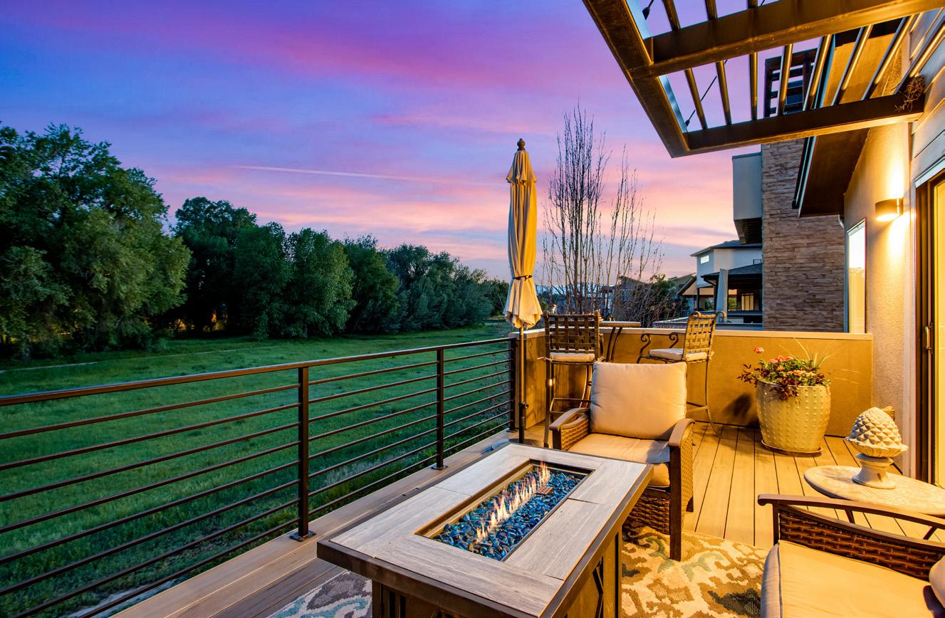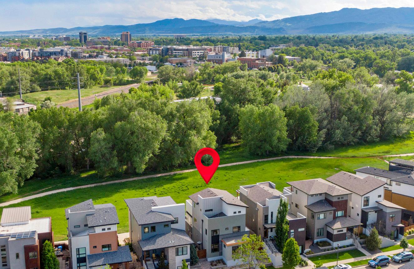 Vaught Frye, this contemporary home with an industrial flare boasts tall ceilings, expansive windows, exposed steel beams and ducting, a floating steel + wood staircase flanked by stainless steel cable railings guiding you to four distinct living areas/levels. Two large decks offer mountain views while backing to the private open space. Location simply does NOT get better - a 5 min stroll or cruiser bike ride to New Belgium, Old Town FTC, Poudre River kayak park and trail system. The luxurious kitchen features maple hardwood floors, quartz tops, Jenn-air appliances, custom cabinetry w/ under cabinet lighting, coffee/ beverage bar area + water filtration system. All bathrooms designed with floating cabinets, designer finishes. Perched at the top, the entire 4th level is where you’ll find your private primary suite w/ sliding glass doors to your own rooftop deck - star gazing on a clear night as well as City Park 4th of July fireworks. Enjoy a glass of wine on the beautifully created oasis of a side yard with a flagstone patio surrounded by green vegetation + garden bed. Don’t miss the Control4 Home Automation system w/ builtin speakers. HOA fee includes trash/ recycle, Xfinity hi-speed internet and TV. Oversized attached 2 car garage too. Don’t miss out!