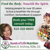 Nutrition counseling service specializing in personalized health and wellness plans. Karen Krchma, is a Registered Dietitian Nutritionist, Certified Dietitian and Biofeedback Specialist who has been practicing in Wisconsin for over 20 years to help individuals achieve goals for vitality. See ad on page 19.