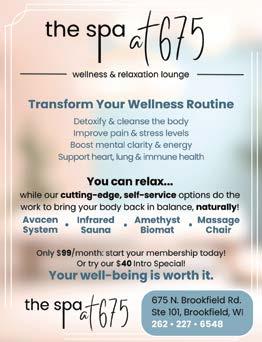222 E Erie St, #150, Milwaukee Milwaukee’s first holistic med spa and modern health club offer holistic medical skincare and facials, nutrition coaching, assisted stretching, personal training and more. Ask about our infrared sauna and cold plunge. See ad on page 17.