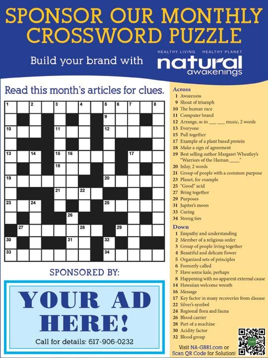 HOW TO ADVERTISE: To advertise with Natural Awakenings or request a media kit, please contact us at 617-906-0232 or email Sales@ NaturalAwakeningsBoston.com. Deadline for ads: the 10th of the month.