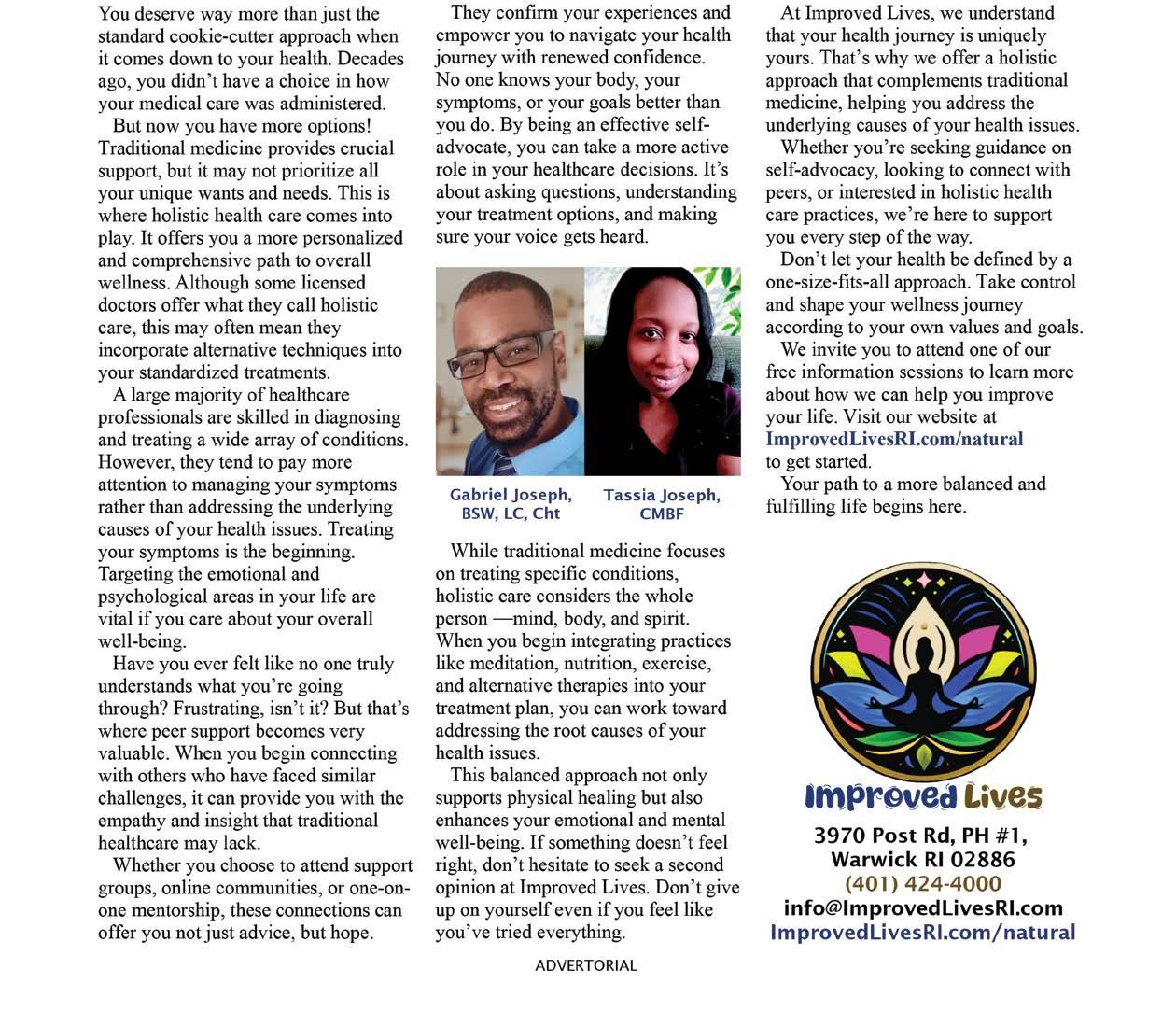 Location: 370 Post Rd., Warwick, RI. For more information or to schedule a free information session, call 401-424-4000, email Natural@ImprovedLivesRI.com or visit ImprovedLivesRI.com. See ad, page 6 and Resource Guide, pages 32 and 33.