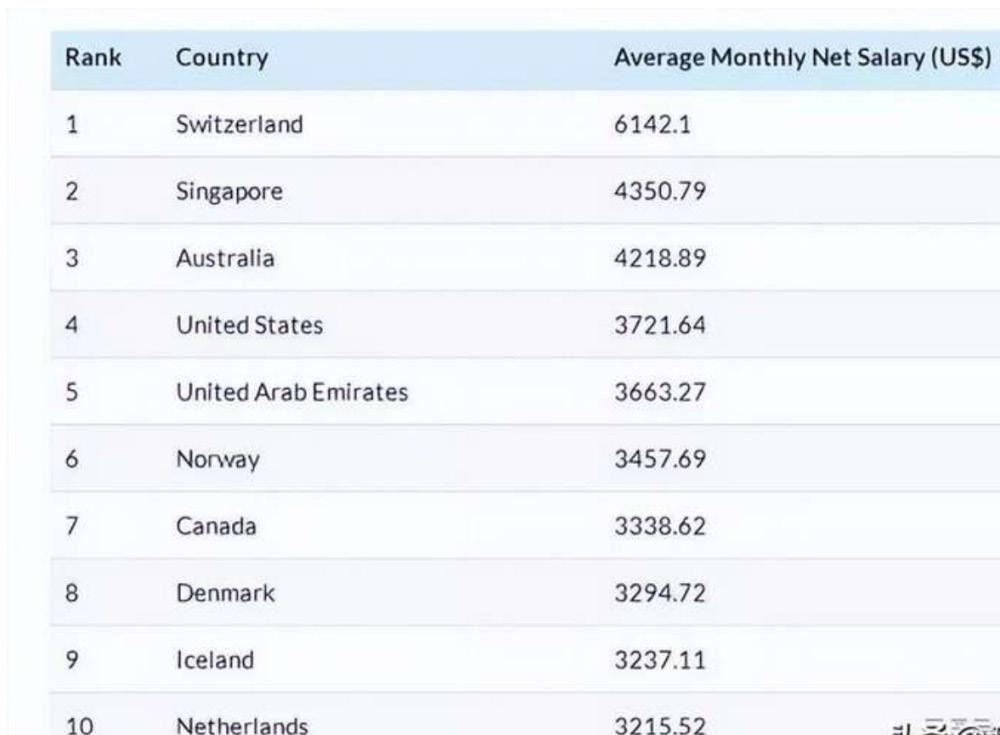 一项全球平均月净工资调查结果显 示,税后工资最高的前十个国家分别是瑞 士、新加坡、澳大利亚、美国、阿联酋、 挪威、加拿大、丹麦、冰岛、荷兰。