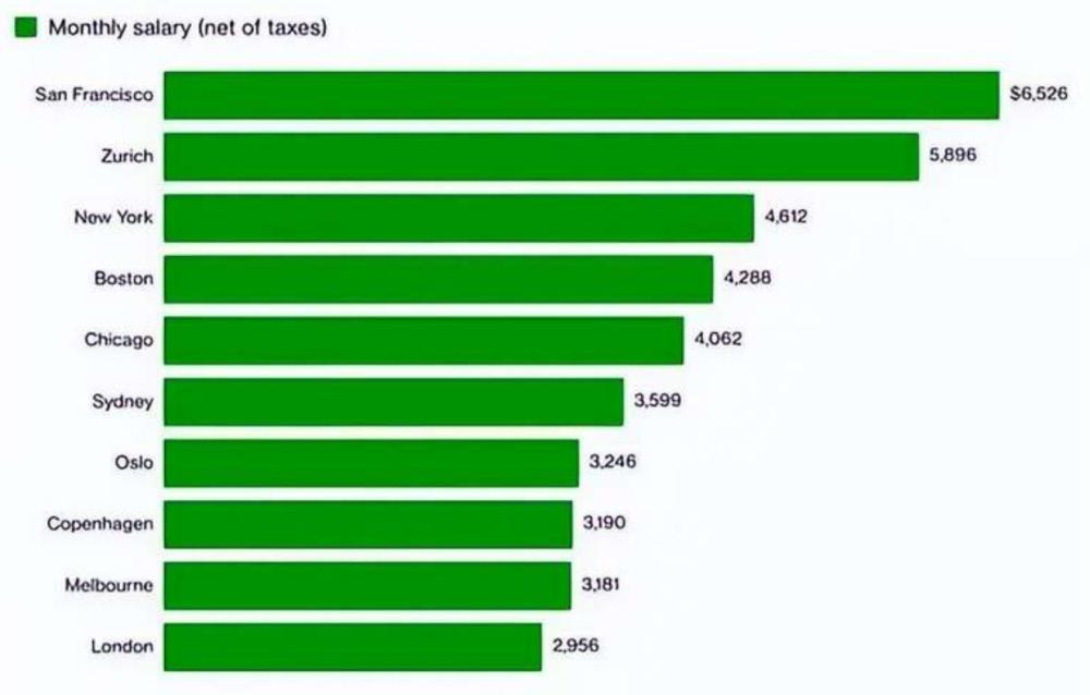 美国税后工资高,其在全球月工资 最高的前十城市里就以旧金山、纽约、波