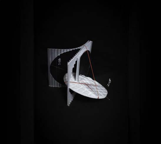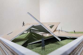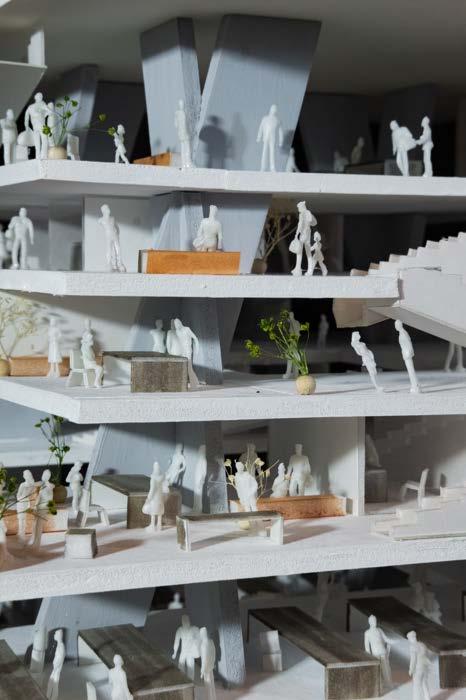 両者を同時に満たす形態を導くために、本設計では「 斜め」の有する流 動性、不安定性に着目した。斜めに傾く構造体、誇大な階段によって導 かれるシークエンスはキャンパスに劇場性を与える。キャンパス全体を 大きな劇場と見立て、流動性を獲得することで、滞った人の流れを潤滑 にすることを試みた。