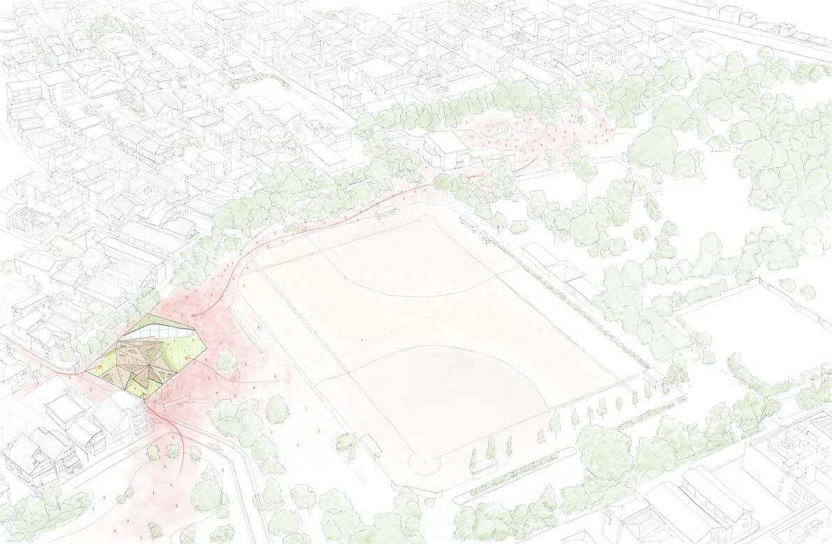 羽根木公園にはプレーパークあり、本敷地はそこ から少し離れた人気の少ない木陰に位置する。 滞った人の流れを呼び戻す。利用者の流入にはプ レーパーク以上の魅力を包含する必要がある。プ レーパークと呼応する子ども食堂を設計する。
