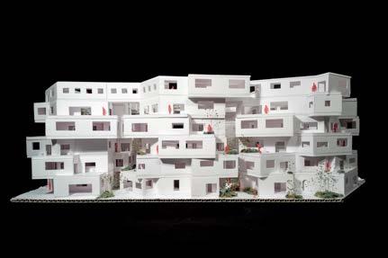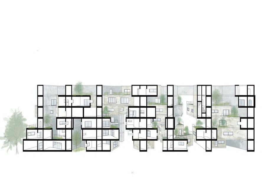全ての住戸の中央を廊下が貫入する 活動が廊下へと溢れ出す 廊下の雑多感と緊張感が生み出す誘い込みと拒み。従来廊下はただの住戸までの通り道であったがここでは交流の場であり、活動の場である。道とも言えない内部空間とも言えない生活感の 溢れ出した空間が僕らを拒む。そして繋ぐ。