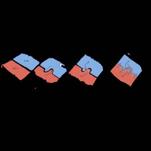流れ道からあらゆる活動が展開され ていく。山から流れてきた水が地形 を侵食し、裾野を広げていくように、 人の流れが活気溢れる街の源流とな り、地域センターから街へと活動を、 活気を押し広げていく。
