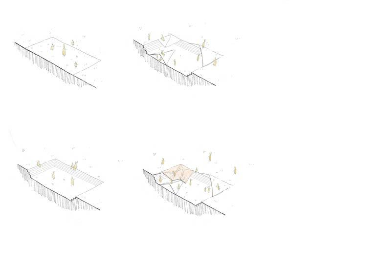 子ども食堂としての機能を担保しつつ、子供たちの本能的な衝動を駆り立てる空間と することで 、滞った人の流れを引き込むことが出来ないか。冒険をするように地をは い、山を駆け上がり、寝たり、座ったり、本能に身を任せて動く子供たちの活動を寛 容に受け入れる器。敷地の大半は機能を限定せず、子供たちの本能を手がかりに使わ れ方が発明されていく、そんな冒険的子ども食堂をここに提案する。