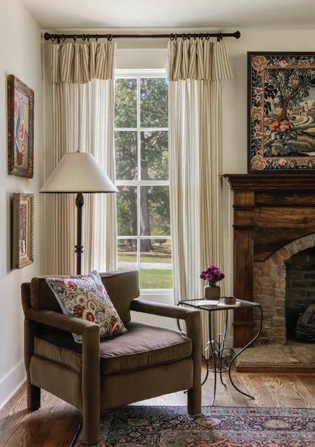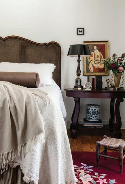 For the living room, the Stacey team found an antique rug and a cache of vibe-setting paintings at Debbie Mathews Antiques & Designs in nearby Nashville. They pulled pintsized vintage chairs up to an easy antique coffee table. They added a tapestry found at a flea market in Paris, and made pillows out of vintage overshot blankets and new floral fabric that’ll be part of the forthcoming Sarah Stacey fabric and wallpaper line, likely out in 2026.