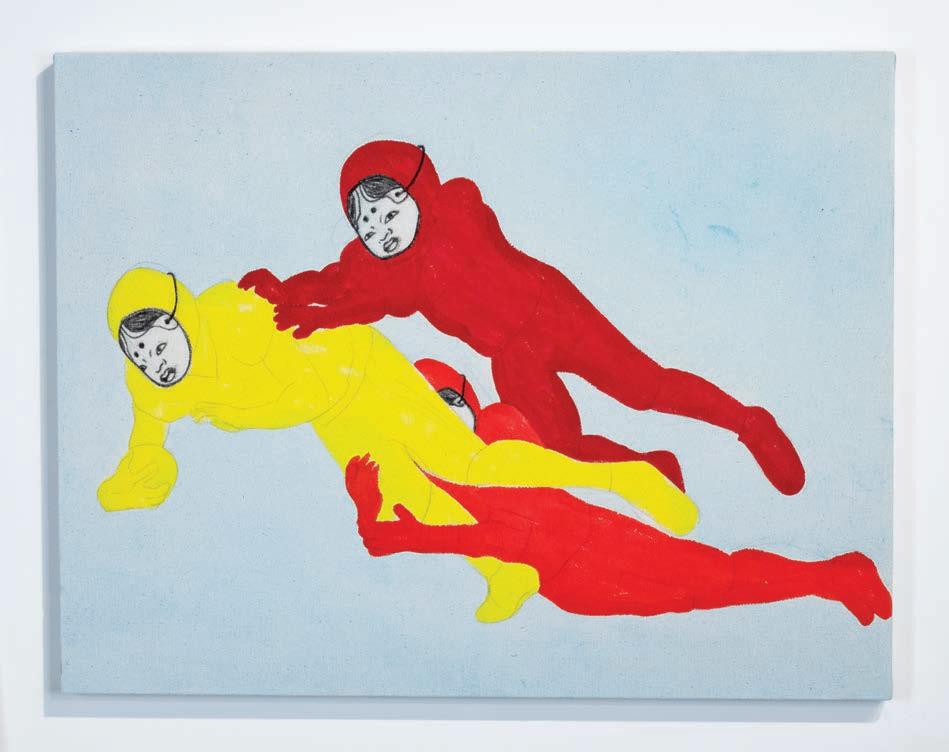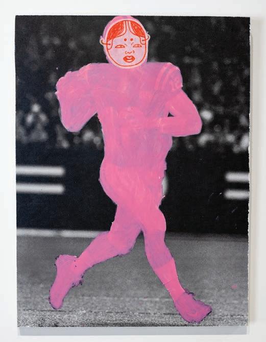 “I’ve been drawing a lot of football players, and then I will have them wearing a Japanese Noh mask, which is used to represent female youth and beauty in traditional performance. So these figures are using gender to represent the two different cultures, kind of dancing and fighting together at the same time.