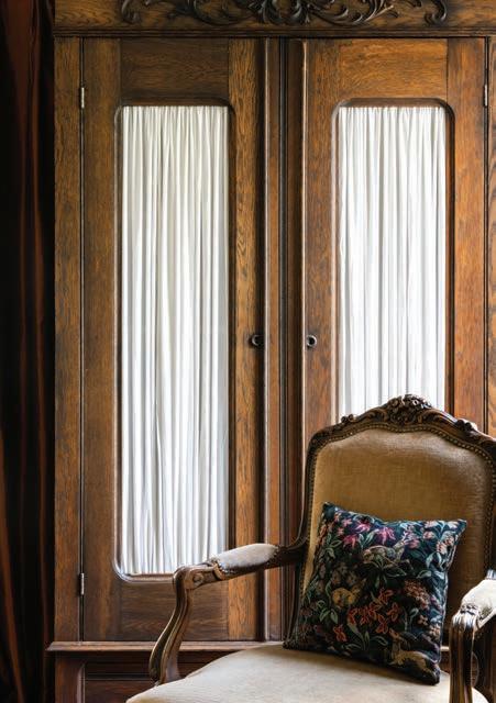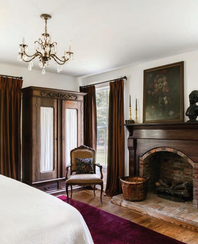 In the primary, a tall armoire with light curtains anchors the space. It’s one of the few close-to-period-appropriate antiques in the restored and reimagined home.