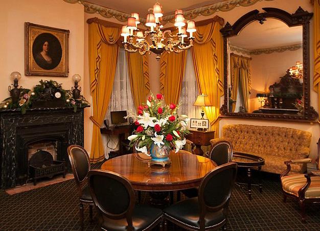 several fine paintings and French porcelain vases. To the left are spacious double drawing rooms with original Belter parlor sets, antique pianos and white marble mantels with hand-carved roses and seashells. Over each mantel hangs a magnificent mirror.
