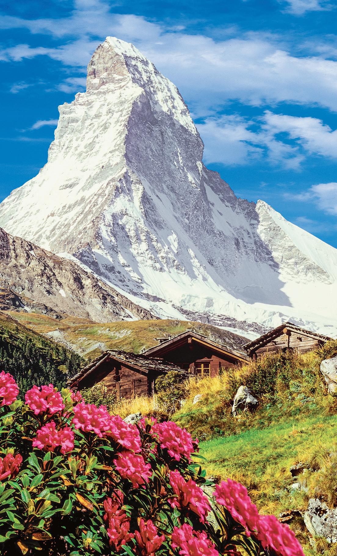 Clockwise from above: The Glacier Express rounds the curve of the Landwasser Viaduct, some 200 feet above the valley floor; pastel-hued villages line the shores of Lake Como; the iconic Matterhorn rises above a blooming valley; hikers follow a trail among rocky peaks near St. Moritz.A spectacular drive through Alpine valleys brings us into the Italian Lake District. The countryside is dotted with villas in hues of terracotta, pink, ochre, and gold—nestled amid tropical vegetation and lush gardens. Our destination is the lovely village of Varenna, perched on the eastern shore of the vast and beautiful Lake Como. Settle into a historic 19th-century hotel overlooking the lake.