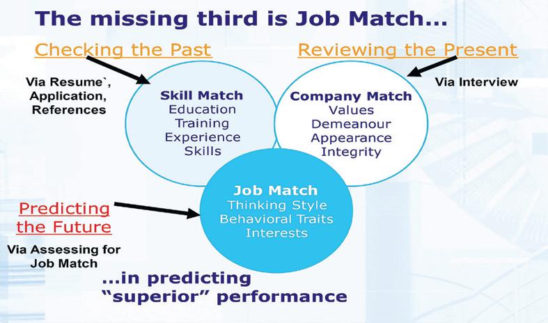 still used by many organisations today. This is checking the past and reviewing the present as illustrated above: Adding the third component of Job Match or Job Fit makes the process complete because we now add predicting future performance as a very important third component to the process. It is critical in today’s working environment to take the guesswork out of hiring decisions and get to know your candidates at a deeper level. This can be achieved by using a psychometric assessment- not just any assessment but one that is valid and reliable so that your decisions are backed by science. While we strongly endorse the use of psychometric assessments, many of them on the market today have not gone through the rigour of a recent validation study making them questionable when important hiring decisions need to be made. For example, one must ask: Does the assessment have questions that are culturally biased?