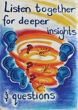 Vasilakes advises, “In a group that is learning together, such as those in the St. Petersburg neighborhoods, group conversations organized around questions specifically crafted for the context and desired purpose of the World Café evoke a deeper kind of listening, the most important factor determining the success of a Café. They spark learn ing conversations that can produce insights and innova tion for meeting the challenges they face. Through practicing shared listening and paying attention to themes, patterns and insights, participants begin to sense a connection to the larger whole.”