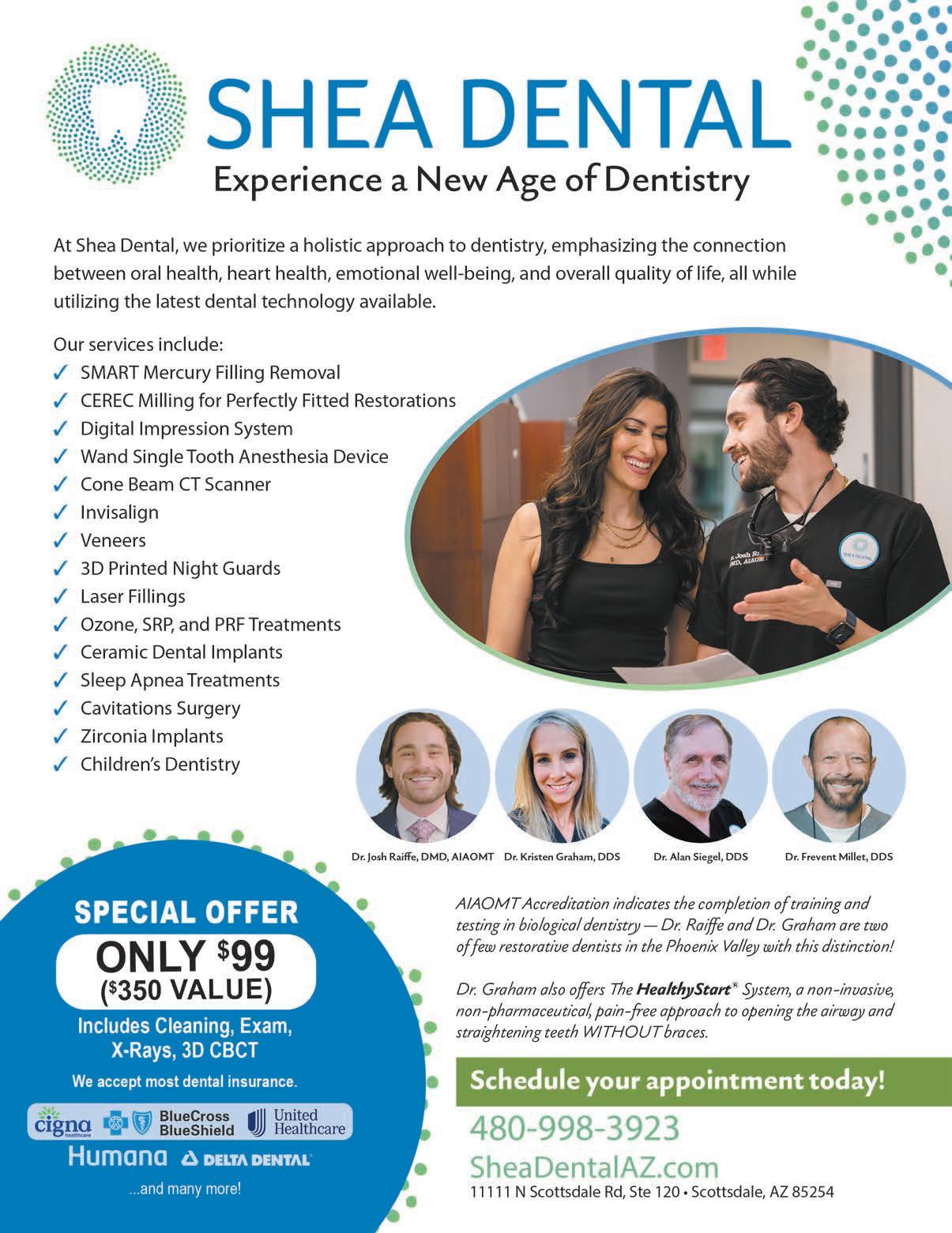 Shea Dental offers holistic dentistry led by Dr. Josh Raiffe, DMD, AIAOMT Accredited. Using advanced technology like CEREC milling, digital impressions, Wand anesthesia, cone beam CT scanning, and SMART mercury filling removal, Dr. Raiffe ensures safe dental practices. Services include implants, veneers and sleep apnea treatments. Accepts most dental insurance. See ad, page 5.