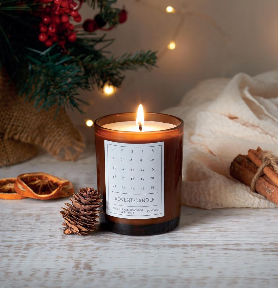 Gold, frankincense & myrrh scented advent candle, hand poured in the UK using a natural plant wax blend and essential oils in a reusable glass jar. 180ml. Burn time 45 hours. Do not leave burning candles unattended.
