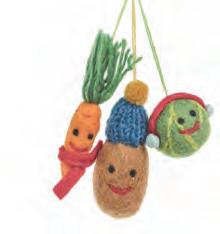 Set of 3 hand felted Fair Trade Christmas decorations. Includes carrot, potato, & sprout. 100% wool.