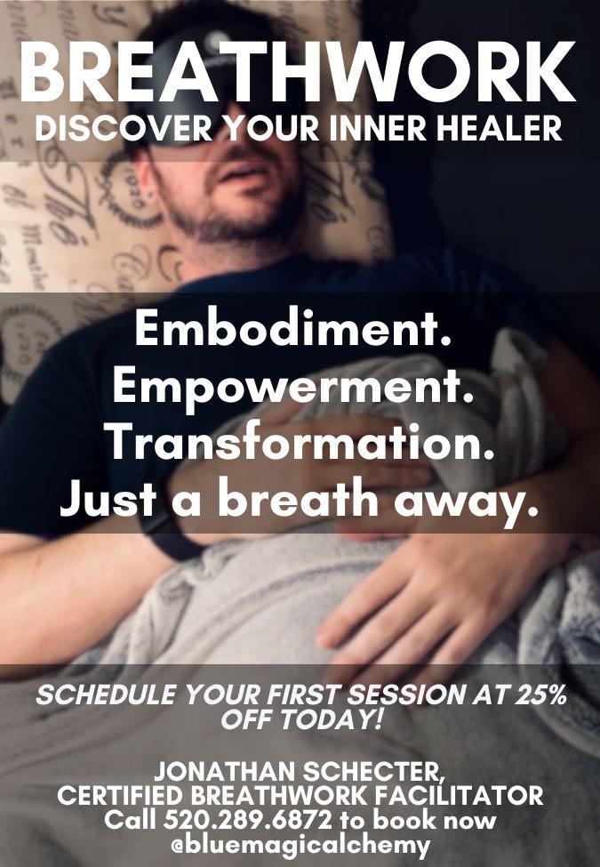 Jonathan Schecter is the founder of Blue Magic Alchemy located at 7555 N. Oracle Rd., in Tucson He is a certified breathwork facilitator, Integrative Specialist, and Somatic Experiencing Practitioner in training, with a passion for helping individuals explore non-ordinary states of consciousness for clarity, nervous system regulation and connecting to purpose. For more information, call 520-289-6872 or visit BlueMagicAlchemy.com. See ad, page 8.