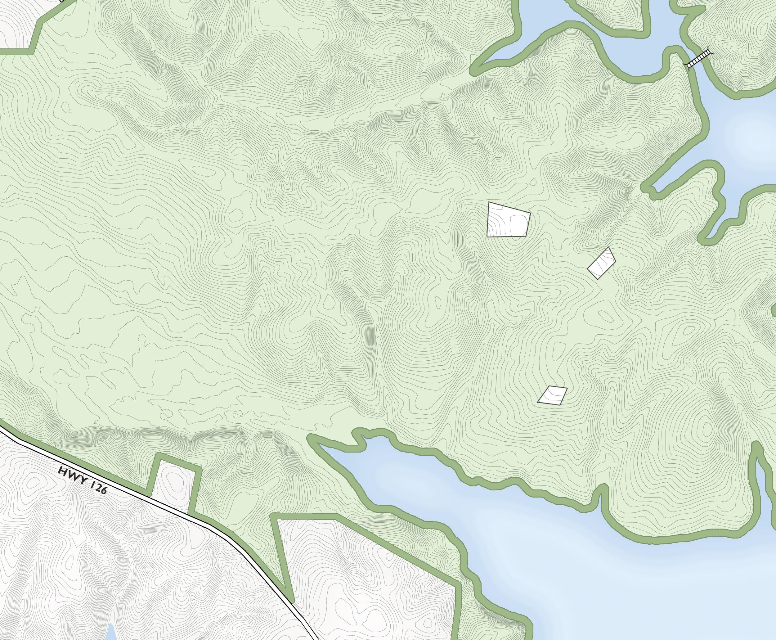 A second park entrance will be located on Highway 126, about one half mile south of the Linville bridge. This entrance will provide access to a second ranger residence, tent camping and a parking area as well as the proposed trail system located at the northern extent of the Long Arm Peninsula. This northern entrance will also provide access to the large internal parcel retained by Crescent Resources which is planned for development as a lodge retreat facility. Private parties interested in equestrian trail riding plan to open a dialogue with the federal government with the goal of obtaining an equestrian trail link into the Pisgah National Forest through the federal gamelands across Highway 126 from Long Arm Peninsula. If this access is granted, trail head facilities with horse trailer parking could be added at the second park entrance.