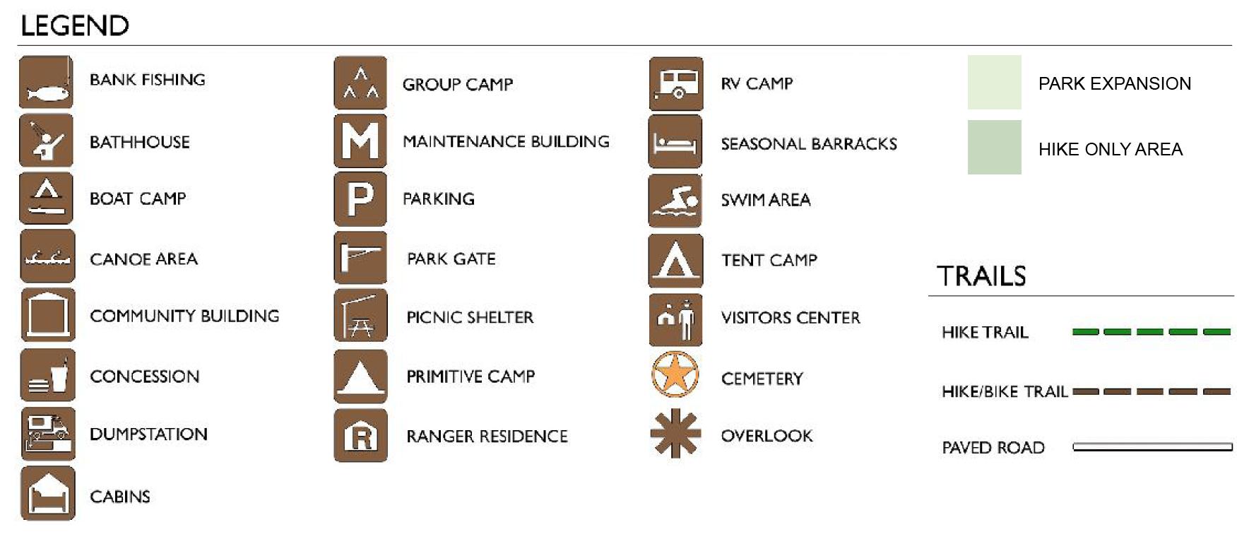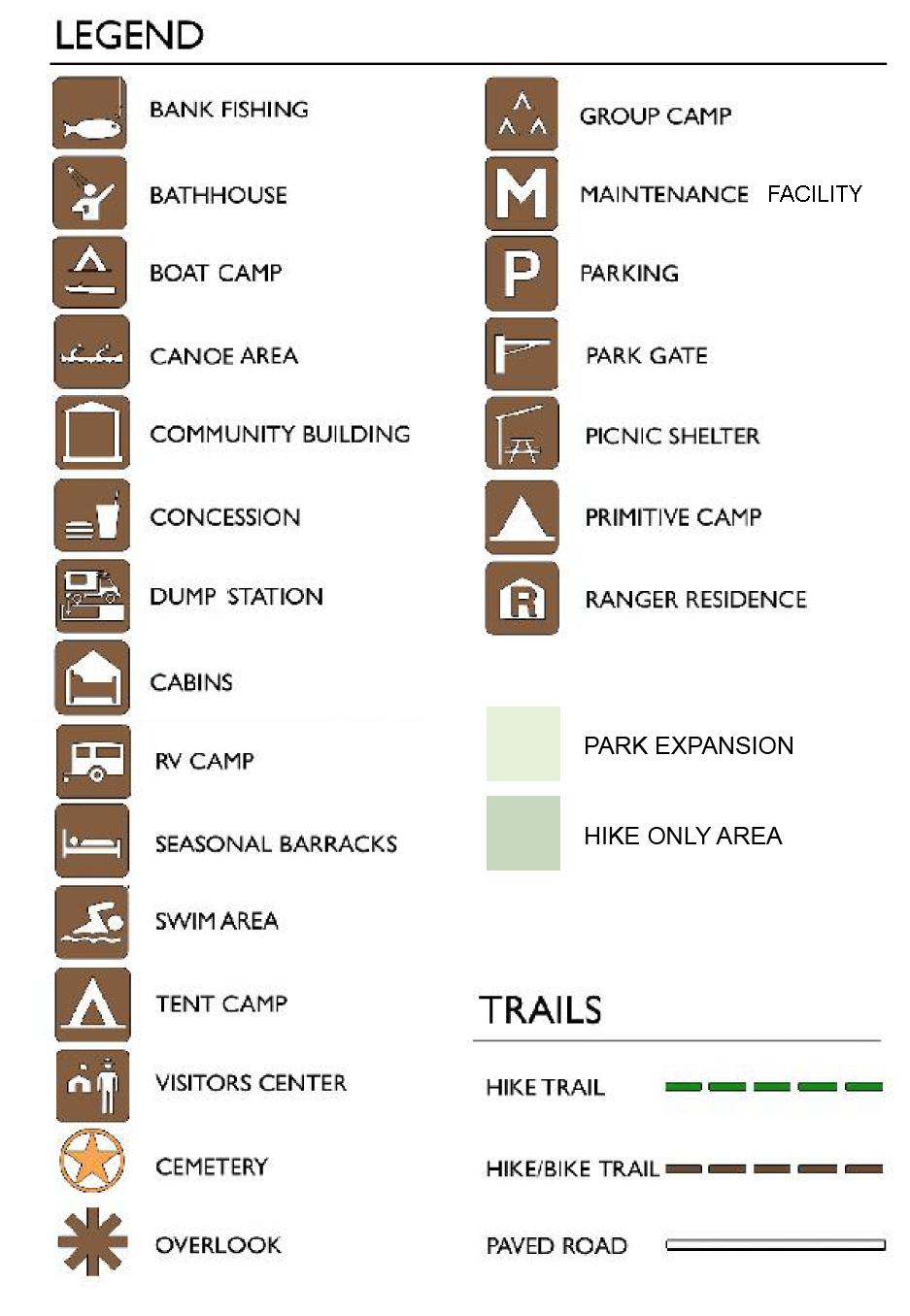 Overnight facilities on Paddy Creek Peninsula will provide for tent camping, group camping, recreational vehicle camping and rustic rental cabins. Primitive camping is planned at the western head of the interior cove and at the southern most reaches of Long Arm Peninsula. A pedestrian and service bridge is proposed across the upper reaches of the interior cove. This bridge will provide an alternate route to Long Arm Peninsula for hikers and cyclists. The bridge will increase the number of trail routes available within the park and may be designed to accommodate fishing. Trail locations indicated on the master plan are general as specific sitings will be determined in the field by the division trails specialists.