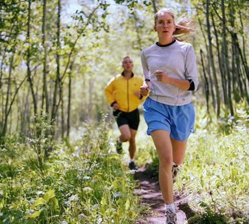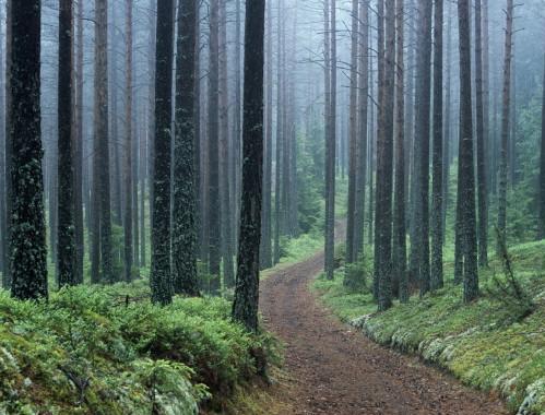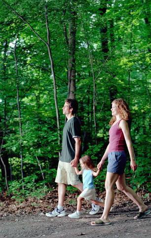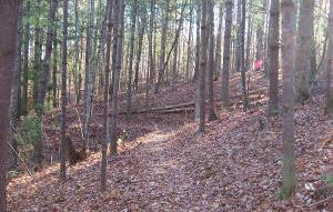 Mixed and hardwood forests are found on the steeper slopes, along the shoreline and in the stream drainages. Above, a typical trail through the woodland moves parallel with the topography.