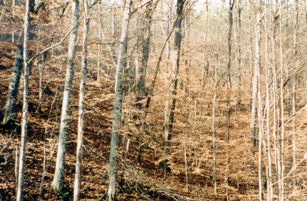 The impact of successive tree harvesting is clearly revealed through the vegetation on the site. Logging roads, which can be seen on aerial photograph on page 22, have been cleared and roughly maintained. Cleared processing areas, also quite evident on the aerial, are dotted with large brush piles where grasses, broom sedge, briars and pine seedlings have emerged. Areas more recently harvested in 1998 are now covered with pine thicket. These thickets dominate the upper areas of the western portion of Paddy Creek Peninsula and large parts within the Center Parcel. More mature stands of pine mixed with early succession hardwoods are characteristic of areas of more aged growth. The most mature woodlands are generally located across the steeper slopes, along the lake shore and across the bottom lands of the streams on site. In these areas, significantly larger trees are found. Oak forests are predominant along the dry slopes. The greatest concentration of mature woodland is on the Long Arm Peninsula.