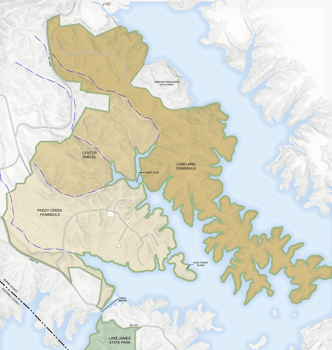 The new park parcel is located off Highway 126 on the northwestern shore of Lake James. The site extends from a narrow strip of land that is contiguous with the Canal Bridge, then north across Paddy Creek ending just short of the Linville River. The newly acquired property is over 2,900-acres with major land divisions identified as the Paddy Creek Peninsula, the Long Arm Peninsula and the Center Parcel.