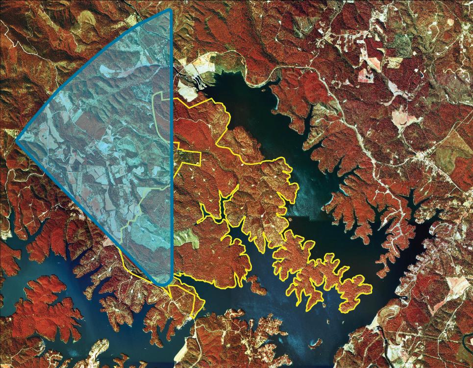 Viewshed from the central ridge off Paddy Creek Peninsula captures views of Table Rock and Shortoff Mountain