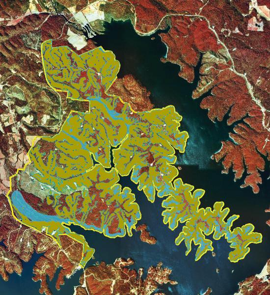 Above is an aerial infra-red photograph with an overlay of the 300’ riparian buffer indicated in light blue. This buffer applies to the entire lake shoreline and to both sides of all streams within the park property. The new park property boundary is delineated by the yellow line.
